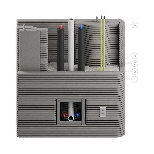 ICON’s 3D-printed double-shell wall system extrudes rapidly curing CarbonX to form a monolithic, load-bearing assembly with alternating reinforced cores, a continuous insulated cavity for MEP routing, and uninterrupted load paths that eliminate traditional formwork and jointed construction.