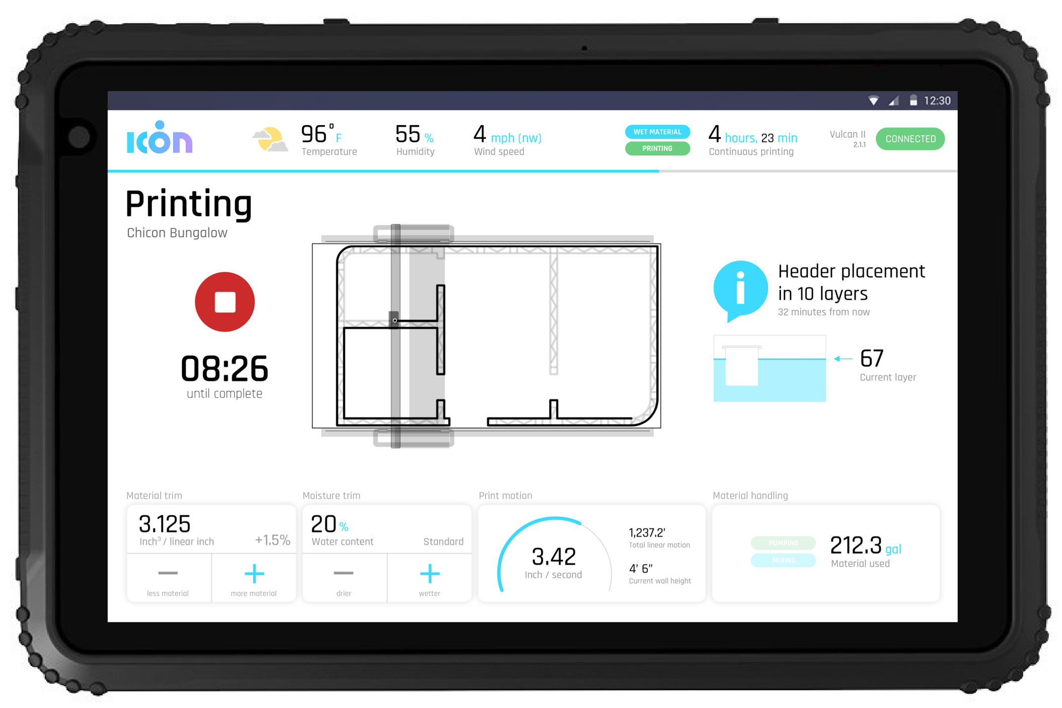 ICON's Magma system is the first end-to-end automated material delivery system for use in 3D printed construction. Using one of ICON's proprietary Lavacrete blends (specific to climate and location) the Magma system mixes Lavacrete, additives, and water automatically from built-in reservoirs. The Magma system then supplies the ready-to-print Lavacrete to the Vulcan II tuned to a specific temperature, humidity, altitude, and speed.